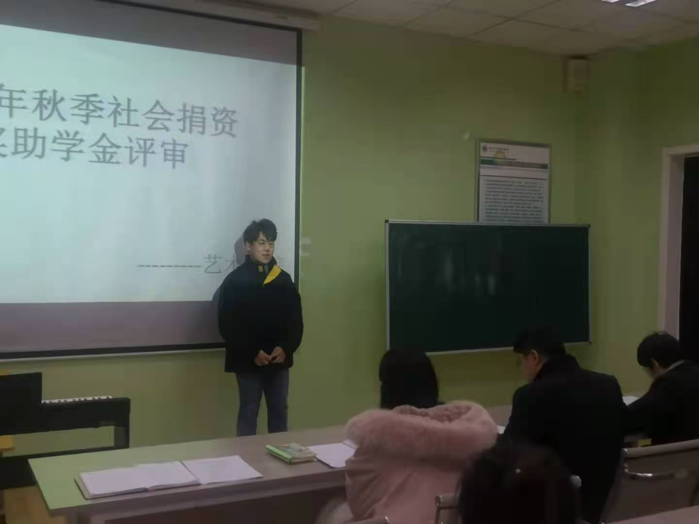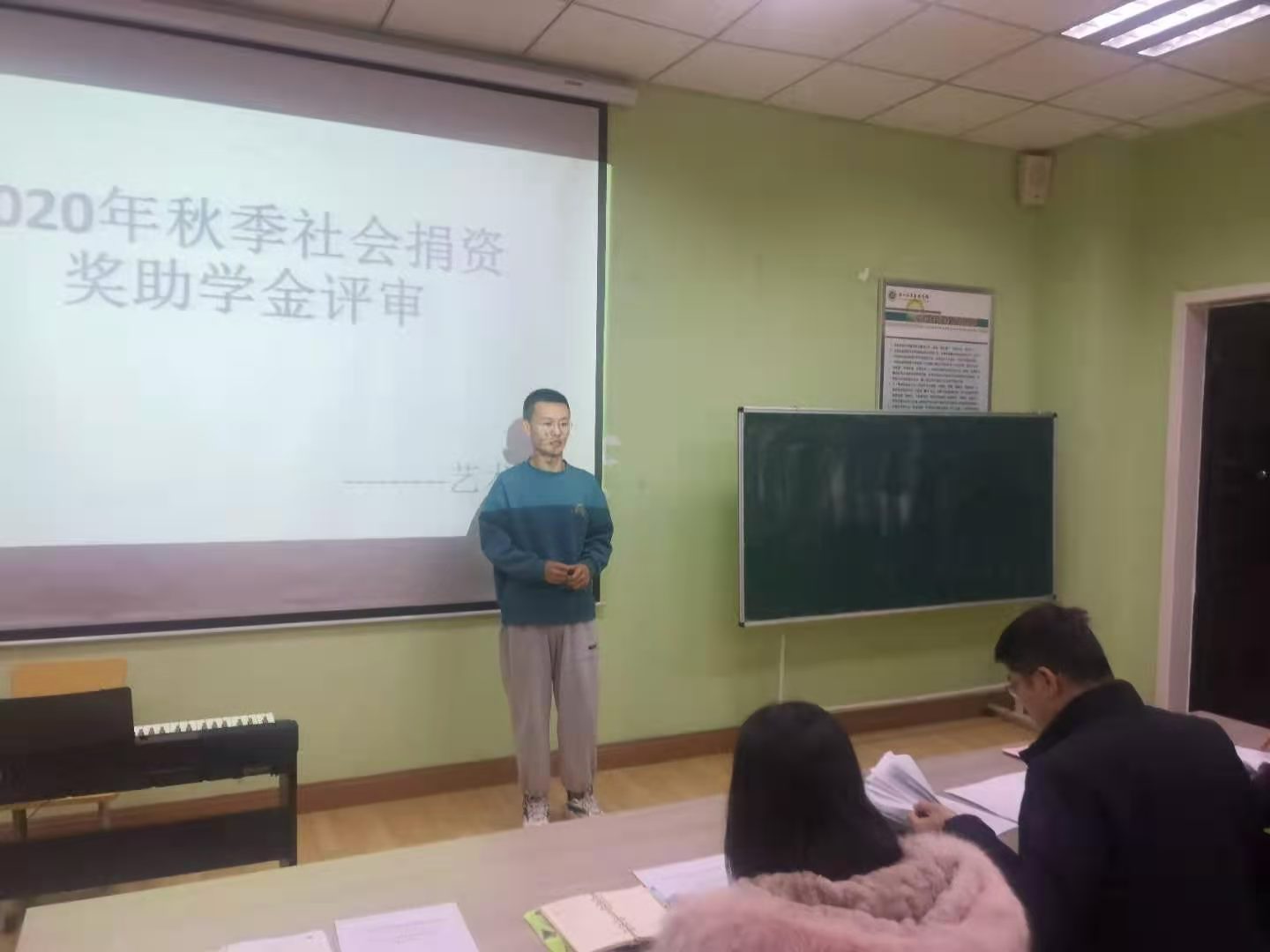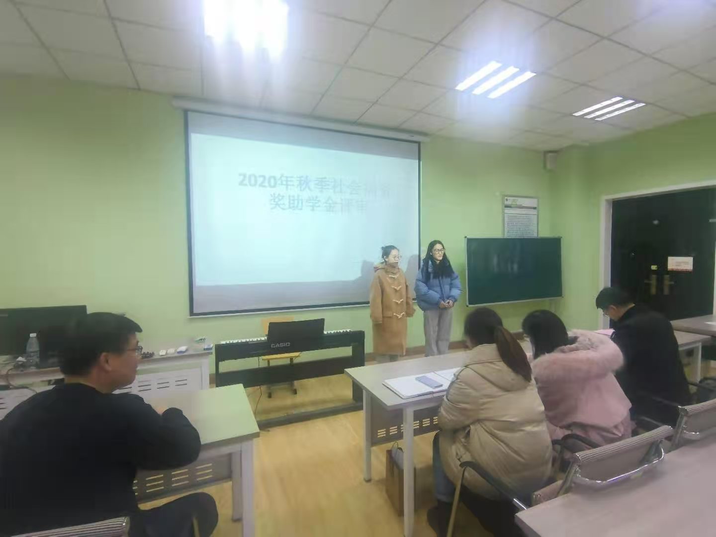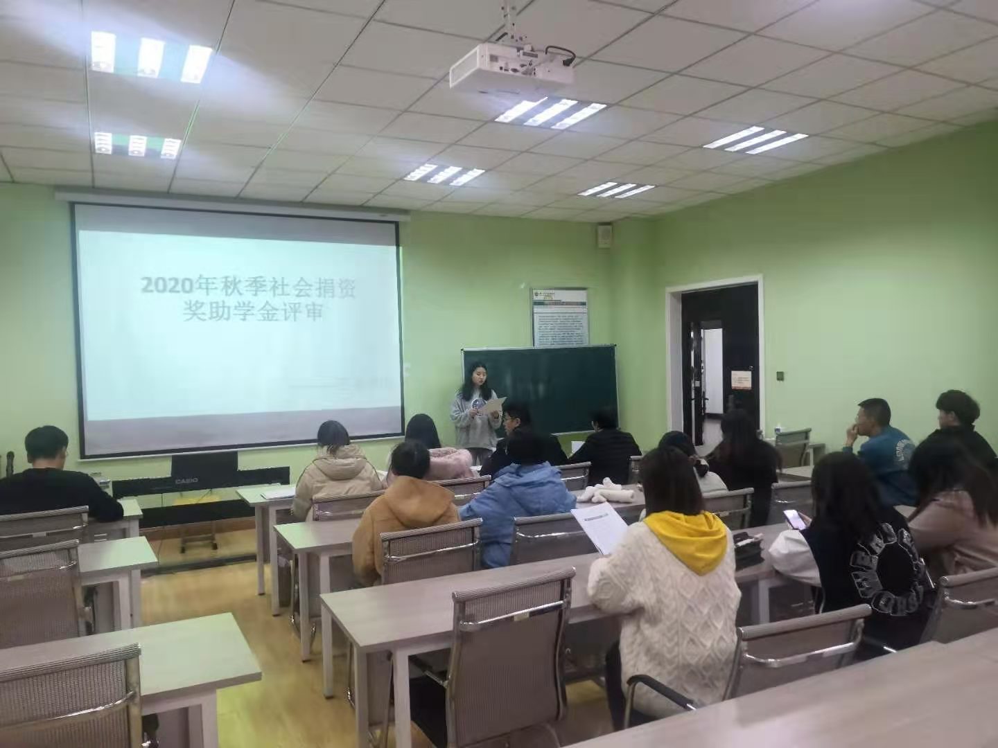 2020年秋季社会捐资奖助学金答辩评审会在9号楼526研究生教室召开,参加会议的是学生工作组党委副书记田维飞,学生科科长夏志丽、学生科副科长吕超,童颜视频辅导员刘维佳、王帅出席评审会并担任评委。经前期个人申请、班级评议和童颜视频初审环节,共有16名同学进入终评。评审会由辅导员王帅主持。