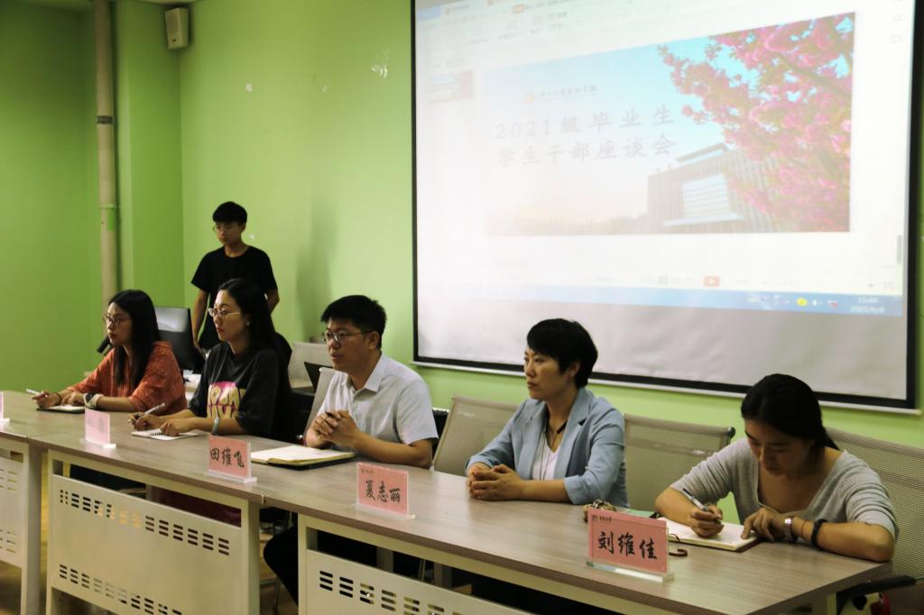 召开2021届毕业生学生干部代表座谈会,聆听毕业生学生干部代表的成长心声,为毕业生即将开启人生新征程加油鼓劲。院党委副书记田维飞,团委书记杜鹃,学生科科长夏志丽、副科长吕超,辅导员刘维佳及2021届团委学生会学生干部代表参加了座谈会。会议由院党委副书记田维飞主持。