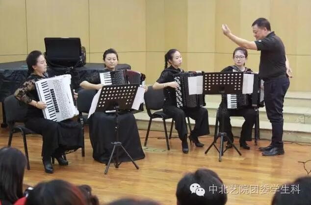 同时,还从手风琴乐队化的不同形态、国内手风琴乐队大事记回眸、手风琴乐队的声学特征、合奏训练有着独奏不可替代的作用等方面展开了讲解,最后四位手风琴教师现场演奏了张教授改编的几首曲目,让观众们大饱眼福。